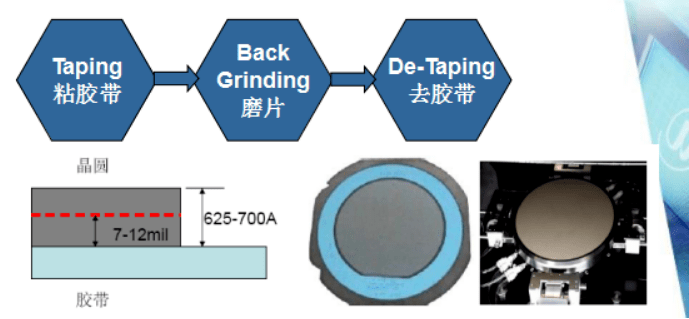 將從晶圓廠出來的Wafer進行背面研磨,來減薄晶圓達到 封裝需要的厚度(8mils~10mils);