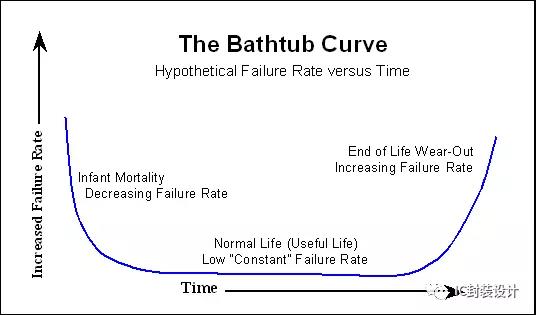 在介紹一些目前較為流行的Reliability的測試方法之前,我們先來認識一下IC產(chǎn)品的生命周期。典型的IC產(chǎn)品的生命周期可以用一條浴缸曲線(Bathtub Curve)來表示。