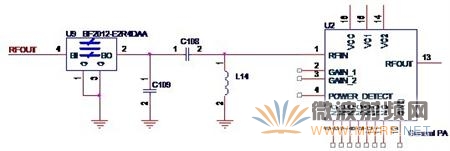 以上我們討論了功放電路的輸入回路的兩個(gè)組成部分,帶通濾波器和Π型匹配網(wǎng)絡(luò),有了這兩個(gè)部分,我們就可以設(shè)計(jì)一個(gè)完整的輸入回路了。如圖3-6所示,就是一個(gè)設(shè)計(jì)完整的功放電路輸入回路。圖中的U9就是一款成品的帶通濾波器,而C108,C109和L14就組成了一個(gè)Π型匹配網(wǎng)絡(luò)。