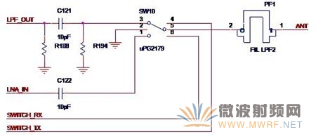 如圖5-3所示,就是Atheros的典型發(fā)射與接收回路SW10就是那顆切換芯片。LPF_OUT是來自功率放大器的輸出信號(hào),R186,C121與R194組成了Π型匹配網(wǎng)絡(luò),LNA_IN是送至低噪聲放大器的信號(hào),SWITCH_TX與SWICTH_RX這兩個(gè)信號(hào)的組合就控制著是打開發(fā)射通路還是打開接收通路。