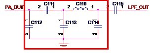 濾波器的設(shè)計(jì)需要很復(fù)雜的計(jì)算,在這里我不想探討過多的理論知識(shí),所以,我就不給出如何計(jì)算的方法,只給出一般的低通濾波器的形式。這里需要指出的是,Atheros的設(shè)計(jì)一般會(huì)使用三個(gè)元件,而Ralink一般會(huì)使用五個(gè)元件。如圖3-7所示,是Ralink常用的濾波器形式。在圖中,C112,C111,C113,C110和C114就組成了一個(gè)低通濾波器,來自功放芯片的信號(hào)PA_OUT經(jīng)過濾波器后得到LPF_OUT這信號(hào)送至后續(xù)電路。